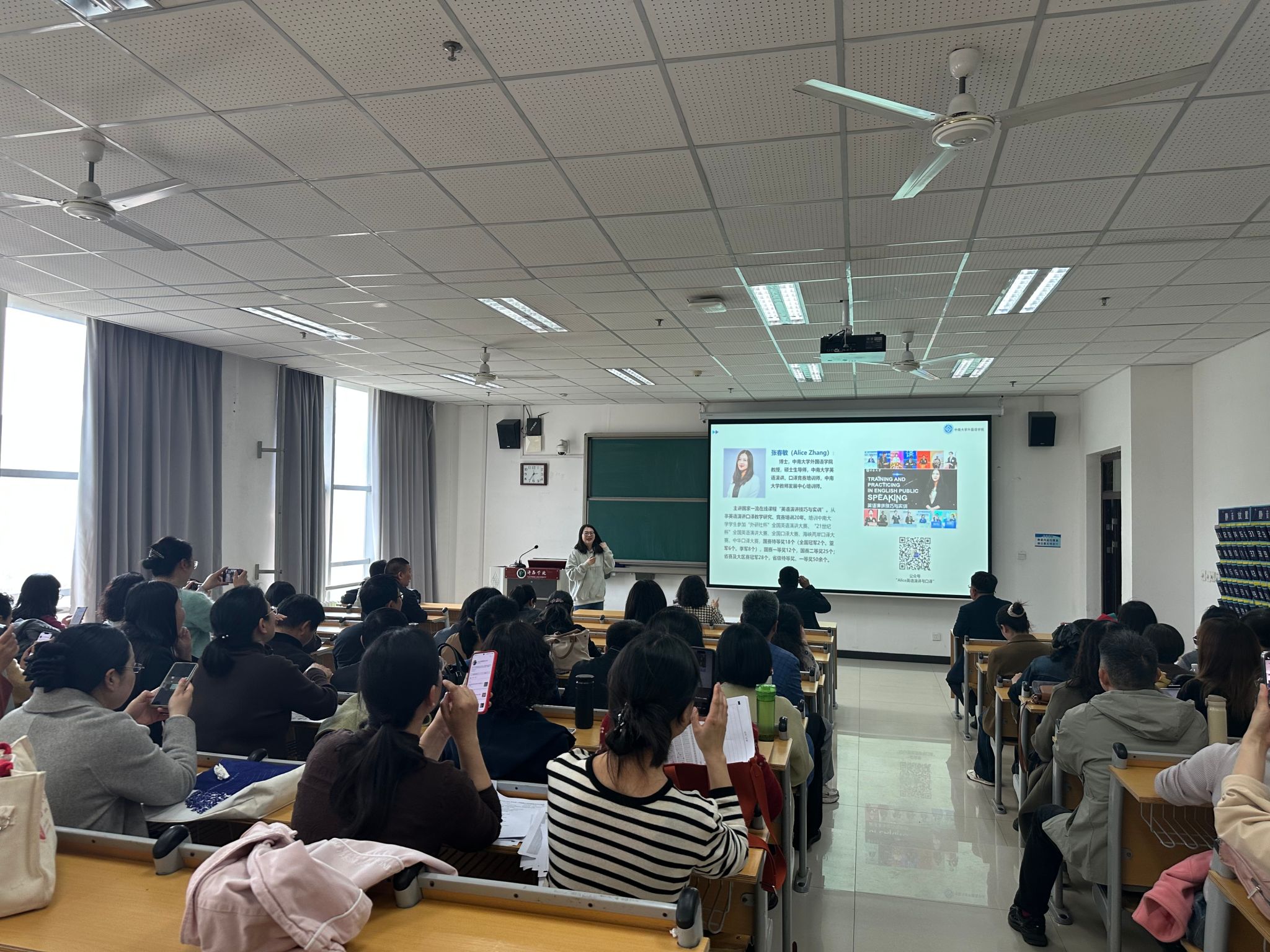 讲座中,张春敏教授以“教赛研融合相长,赋能人才培养——以中南大学演讲教学教赛研模式为例”为主题,以中南大学演讲教学实践为蓝本,从“以课为本、以赛促教、科研反哺、相长共赢”四大维度,系统阐释了教赛研融合的育人模式。她详细介绍了《英语演讲技巧与实训》课程的数字化探索与 AI 赋能实践,分享了将竞赛元素融入课堂设计、建立竞赛梯队培养机制的实操策略,还讲解了从教学实践中凝练学术问题、以科研成果反哺教学的闭环路径,同时结合自身经验,探讨了教赛研融合背景下教师专业发展的成长方向。